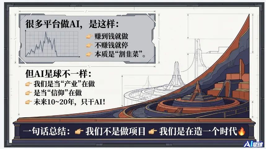 很多 AI 平台:赚到钱就做,不赚钱就停,本质是割韭菜。AI 星球:我们把 AI 当终身事业、长期产业,未来 10-20 年,只专注 AI。我们不是做一个短期项目,我们是在造一个时代。