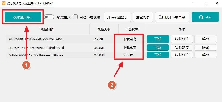 打开软件,点一下“开始监听”。然后正常打开微信,进视频号刷你想下的视频。软件会自动识别并抓下来。