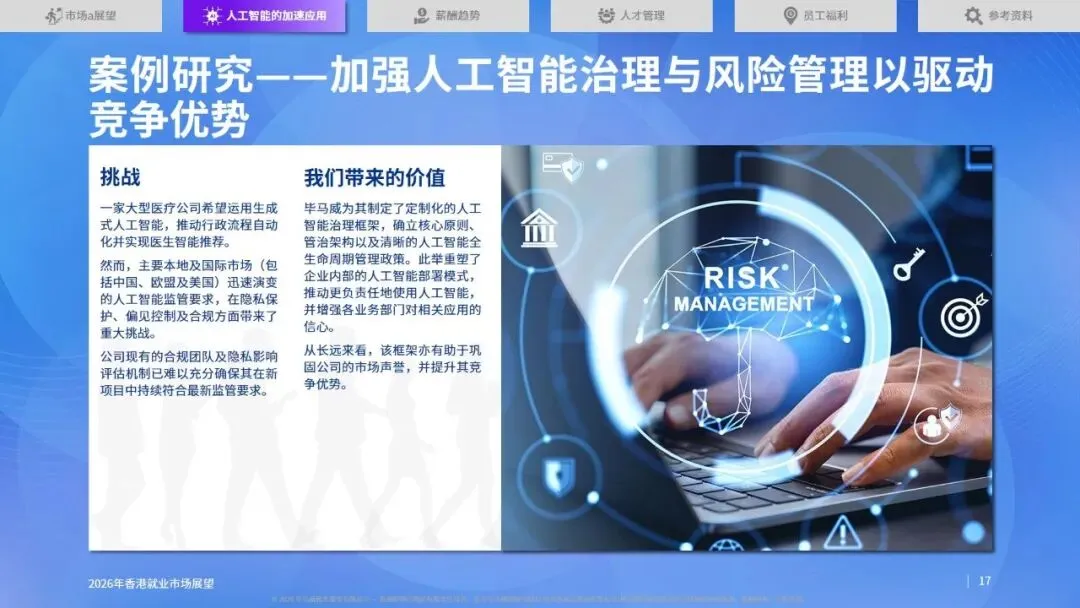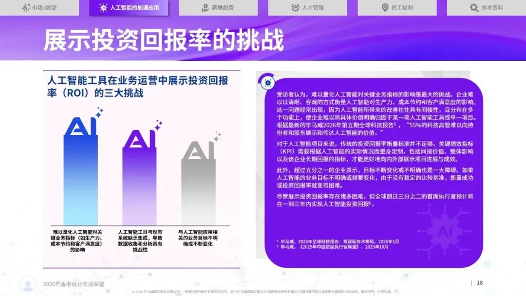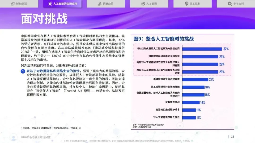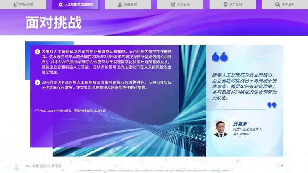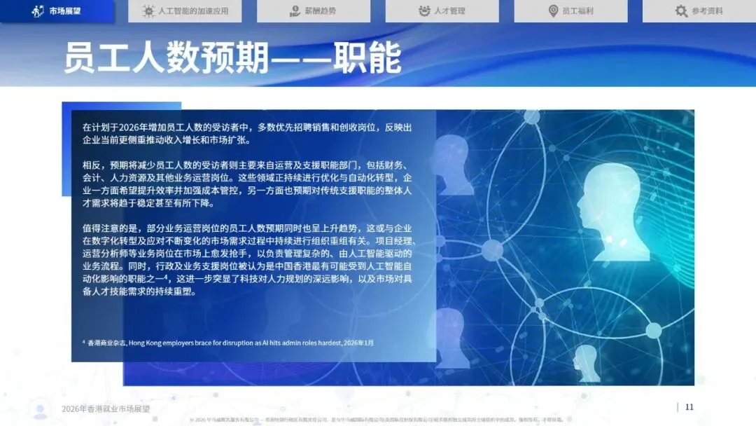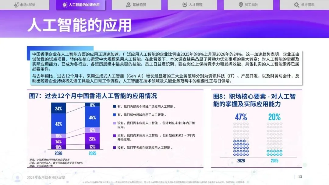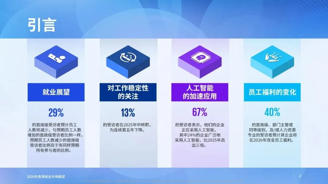 2026年香港就业市场整体呈现审慎态势,企业人力规划趋于保守,仅19%受访者预计增聘,为2020年以来最低,首席级管理者对人员收缩的预期更为显著。人工智能应用进入加速落地阶段,67%企业已采用AI技术,广泛应用比例较去年提升三倍,正重塑工作模式与核心技能要求,企业落地AI时面临供应商甄选、数据安全、内部技能缺口等核心挑战。