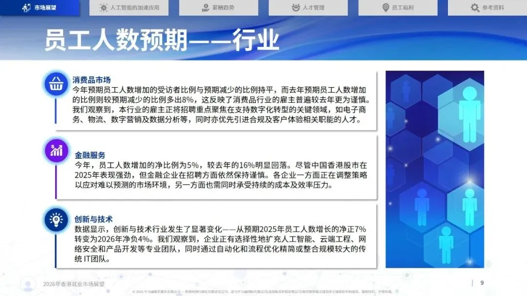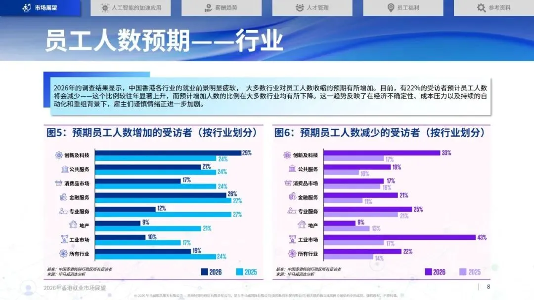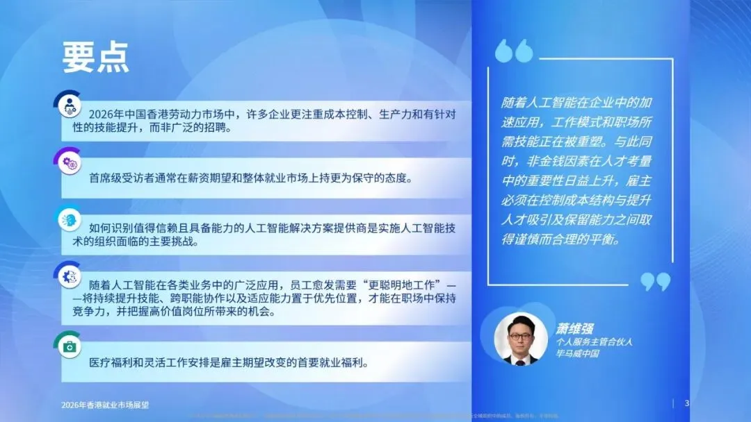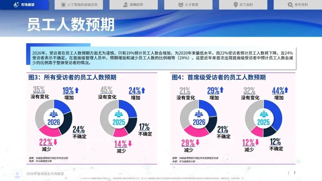员工福利方面,40%企业计划调整福利体系,医疗保障与灵活工作安排为优化重点。整体来看,香港就业市场在经济不确定性与技术变革双重影响下,企业以成本控制、效率提升为核心,人才竞争向高价值、高技能岗位集中,持续学习与AI应用能力成为职场核心竞争力。