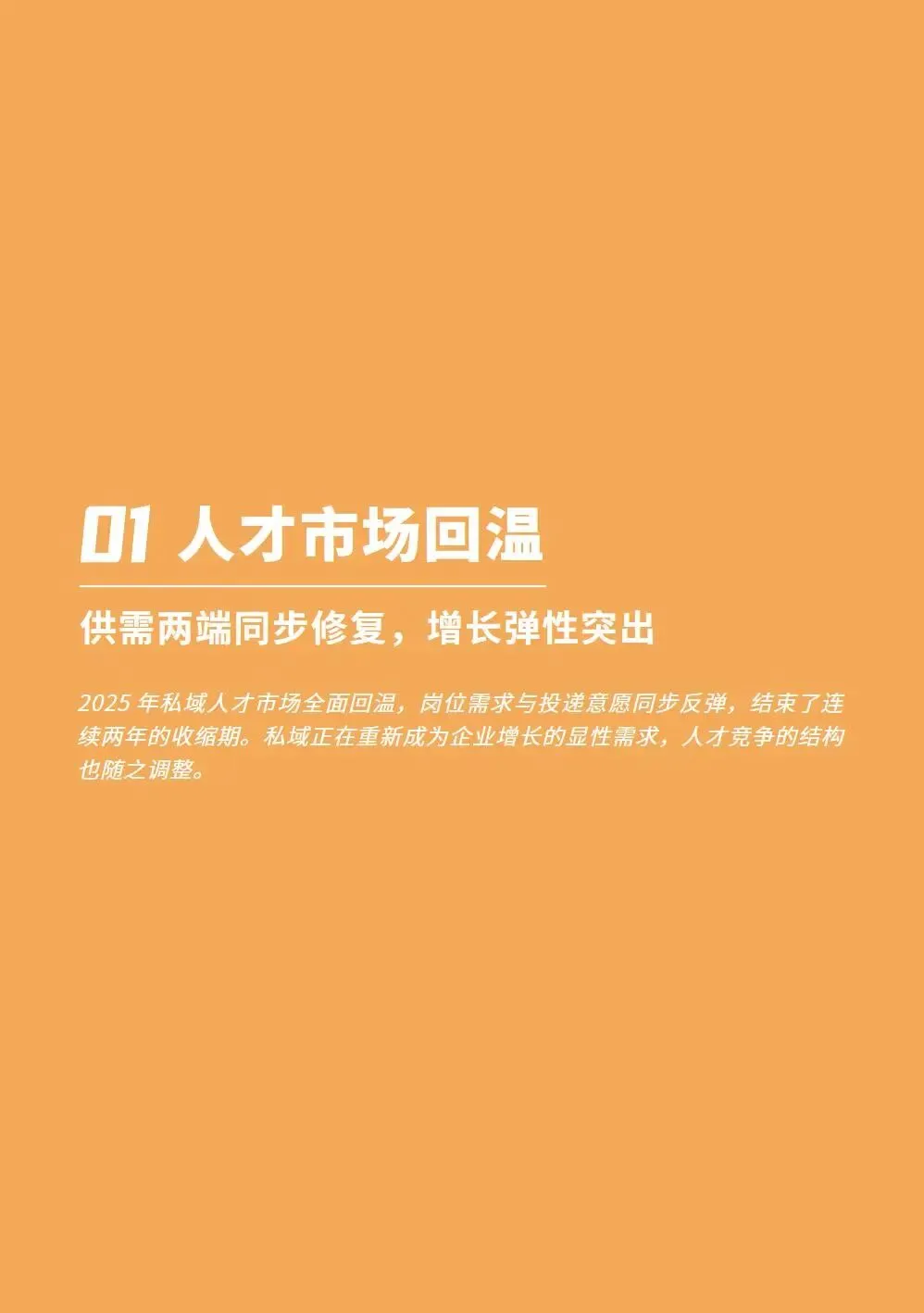 2026私域人才市场呈现供需同步回暖态势,结束连续两年收缩周期,岗位需求增速连续8个月高于去年同期,人才投递活跃度显著回升,用户运营与会员运营成为求职热门方向。当前私域人才市场呈现薪资结构分化、组织结构重构、行业布局外扩三大核心特征:企业招聘向中段薪资区间集中,从业者薪资涨幅收窄,AI赋能组织提效但尚未转化为个体收益;团队规模向中型化调整,岗位经验要求趋于细化,复合型人才需求刚性凸显,AI应用已成行业共识但招聘端能力标准滞后;行业覆盖从互联网、快消向影视传媒、软件、生物医药等领域延伸,区域布局以华南为核心,华中与西南快速崛起,民营企业与中小企业仍是岗位供给主力。本报告基于前程无忧招聘大数据与行业调研数据,系统剖析私域人才供需、薪酬、组织及能力体系变化,为企业人才配置与从业者职业发展提供客观参考。