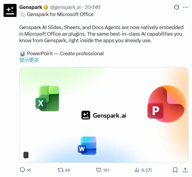 2026年4月8日,Genspark AI通过海外知名社交平台X(原Twitter)官方账号发布重要更新:旗下AI Slides、AI Sheets、AI Docs Agents三大智能助手已以插件形式原生嵌入Microsoft Office,实现AI能力与日常办公软件的深度融合。用户无需切换工具、无需复制粘贴,打开PowerPoint、Excel、Word即可直接调用顶级AI能力,全面提升办公效率。