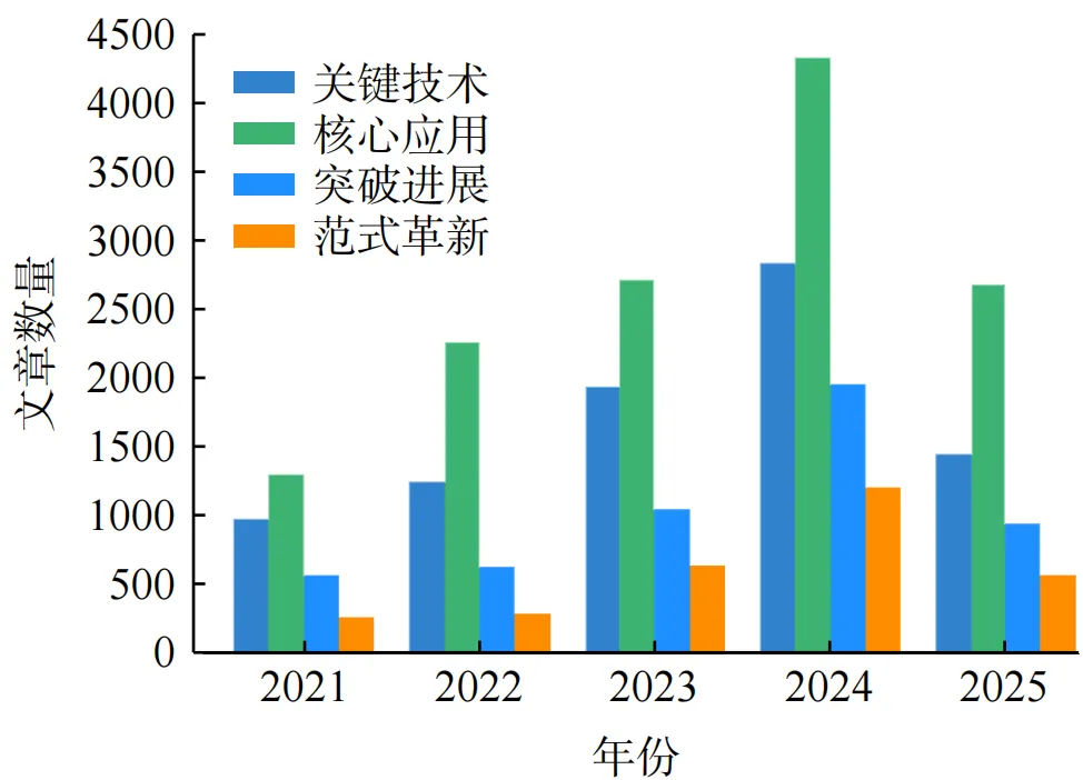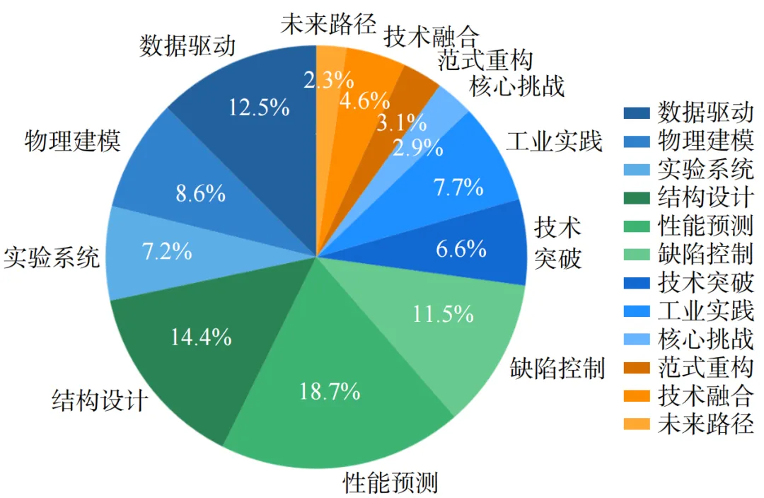 学术研究同样呈现爆发式增长,本文基于Web of Science核心合集、Scopus、中国知网(CNKI)、万方数据知识服务平台及Materials Project等材料专用数据库开展多源检索。如图1所示,2021—2024年关键技术、核心应用、突破进展、范式革新4类文献数量持续增长,领域研究热度逐年攀升;2025年虽仅统计半年,各研究维度均受关注,展现出发展活力。主题分类占比情况如图2所示,反映出研究聚焦材料性能等核心环节,同时也提示需关注数据标准化等未来挑战,以推动领域发展。