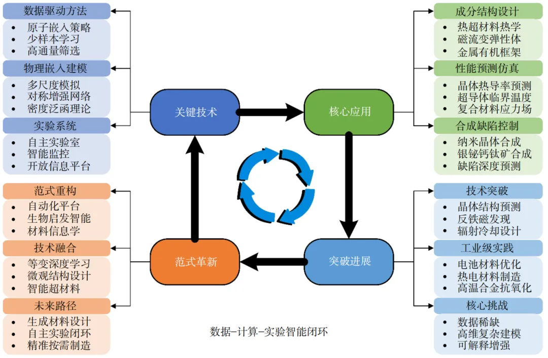 AI驱动的材料成分与结构设计借助机器学习、深度学习等技术,实现材料性能预测、微结构与机械行为关联优化、金属有机框架生成及超材料性能定制,完成新型合金、电极材料等成分筛选与晶体微观结构设计,突破传统试错效率瓶颈,推动材料设计向自动化、定制化发展并加速高性能材料研发进程。