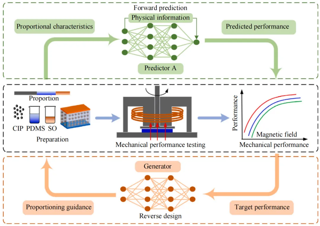 针对成分优化方向,核心是实现目标性能导向的精准筛选与调控。深度学习框架通过集成生成器与预测器,实现磁流变弹性体成分的逆向设计,精准调控其磁致储能模量,磁流变弹性体的深度学习正向预测与逆向设计框架见图4,正向基于比例特性并结合物理信息预测性能,逆向则依据目标性能指导材料配比。