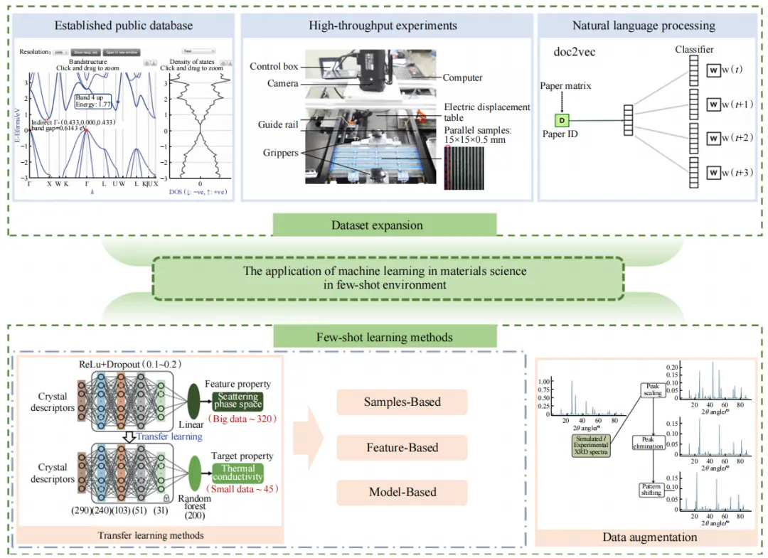 数据扩充环节重点解决材料数据样本稀缺、多源异构的难题。少样本学习通过整合数据库资源、开展高通量实验扩充数据集,材料科学少样本数据集扩展及机器学习方法如图5所示;借助迁移学习等策略挖掘小样本价值,推动数据从“小数据”向“大数据”跨越。