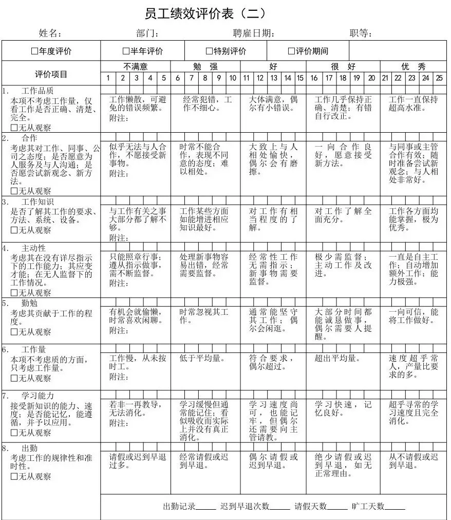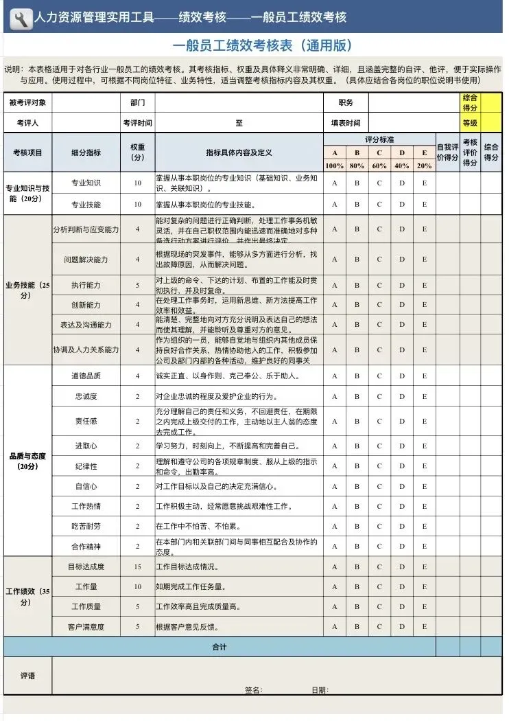 通用版“员工绩效考核表”“部门绩效考核表”,适合刚起步的公司快速上手;