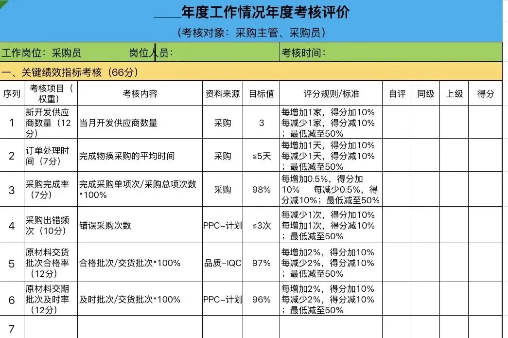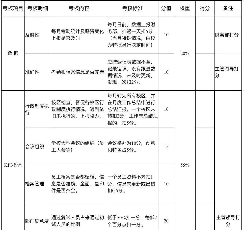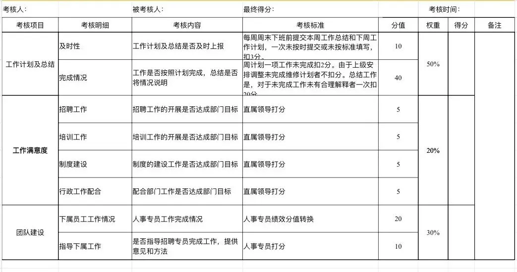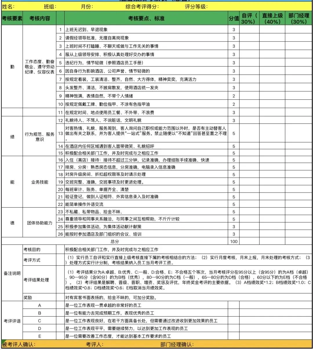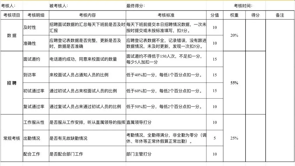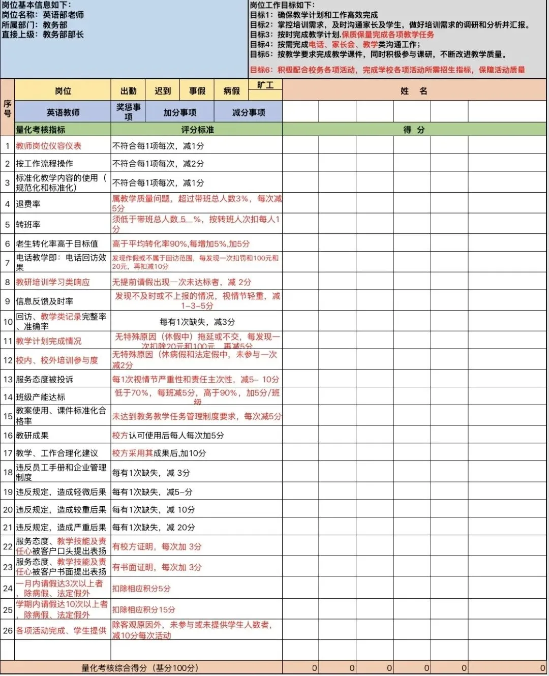 特殊岗位:英语培训教师、QC质检、测试工程师、酒店总台… 比如“英语教师考核表”包含“学生续课率”“家长满意度”,贴合岗位特性。