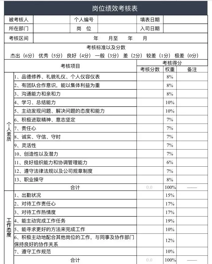 即拿即用:doc版可直接编辑文字,xls版自带公式,填好数据自动算分,省去设计表格的时间;