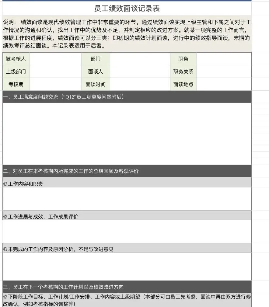 绩效面谈表、申诉表、末位淘汰考评表、成绩统计表… 比如“绩效面谈表”自带“优势/不足/改进计划”填写栏,让考核不只是打分,更能推动成长;