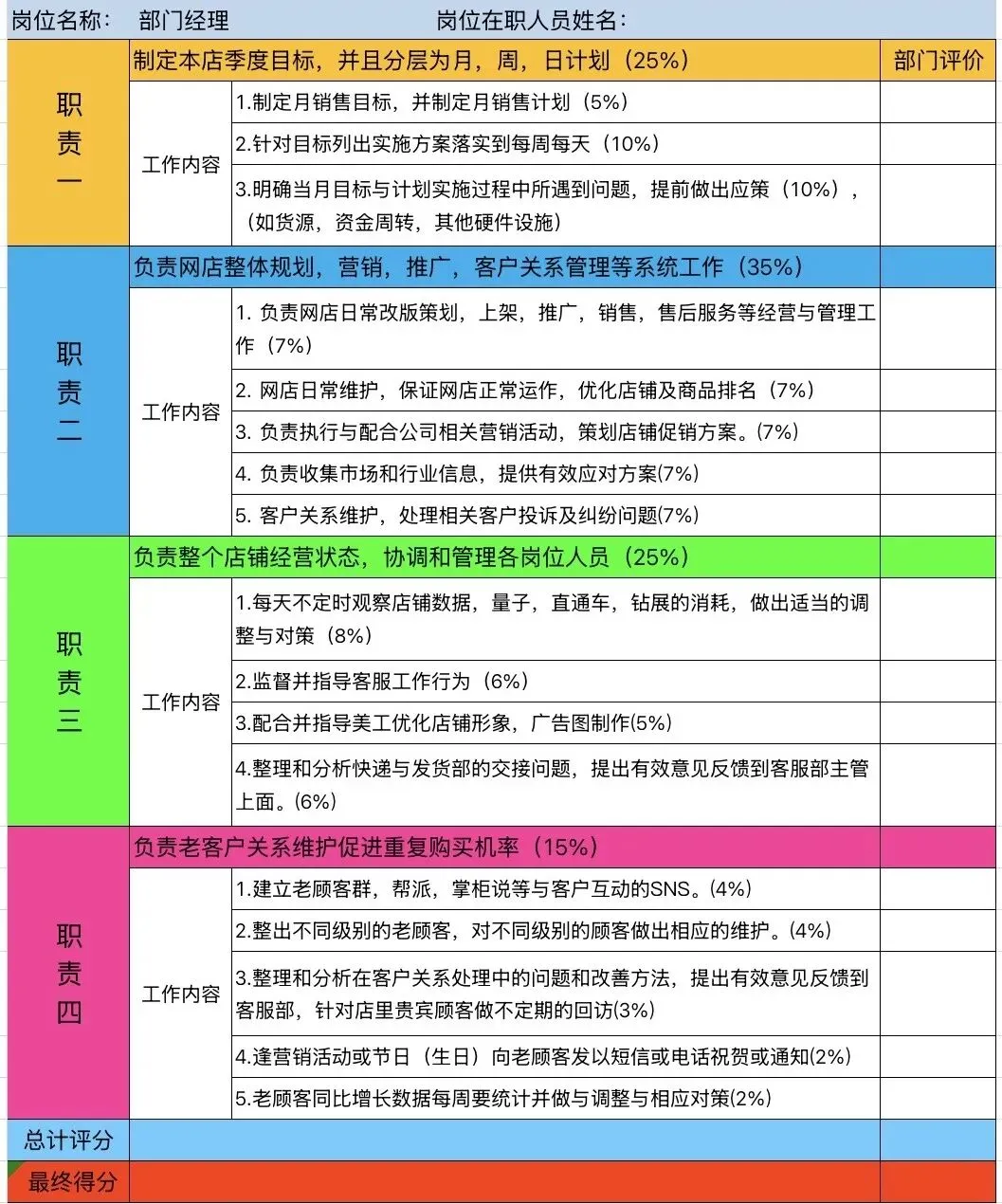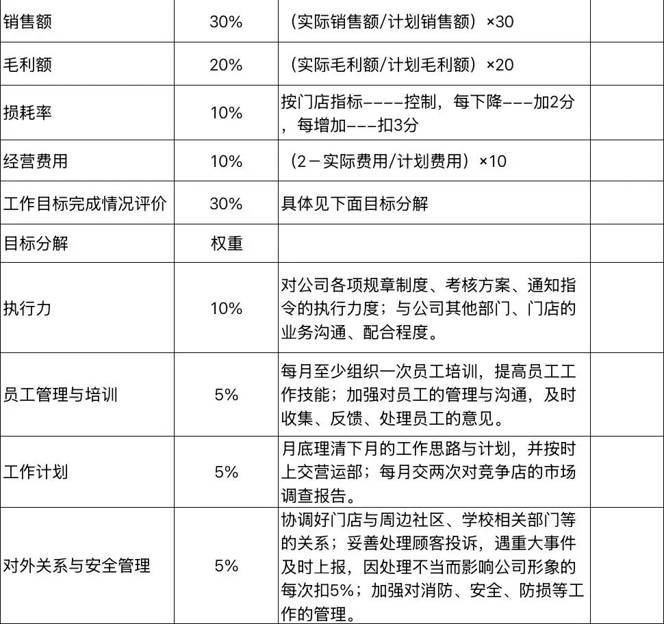 部门主管:门店店长、设计总监、营销经理、招商部主管… 模板里不仅有“业绩指标”,还包含“团队管理”“客户满意度”等维度,比如“门店店长考核表”会看“月度销售额达标率”和“员工流失率≤5%”;