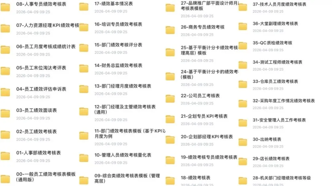 不管你是HR想搭建考核体系,还是初创公司想搭基础考核,还是成熟企业要细化指标,还是管理者要给下属打分,这63份模板都能帮你搞定——从基层到高层,从考核到面谈,全流程模板一站式备齐,再也不用从零开始画表格!