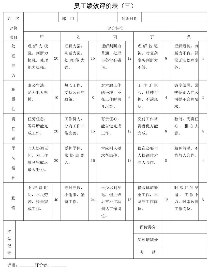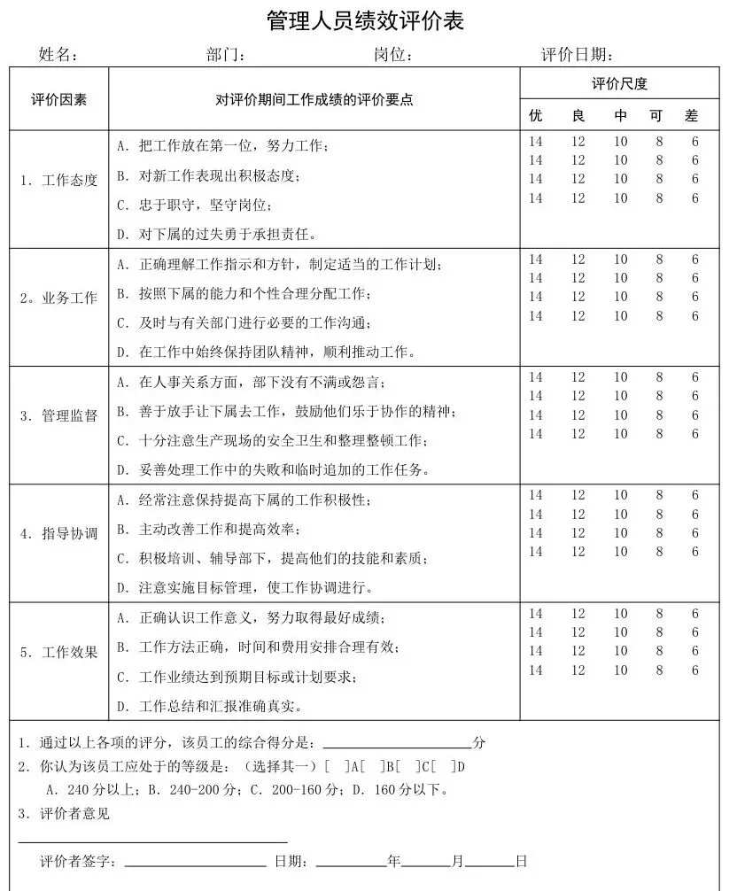 “管理人员绩效考核量化表”“KPI考核表”,把“沟通能力”“执行力”转化为“跨部门协作完成率”“任务按时完成率”,避免凭感觉打分;