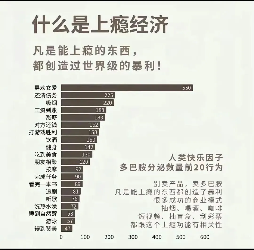 这张“人类快乐因子多巴胺分泌数量前20行为”的图表,清晰地揭示了一个核心真相:商业的本质,就是贩卖多巴胺。
