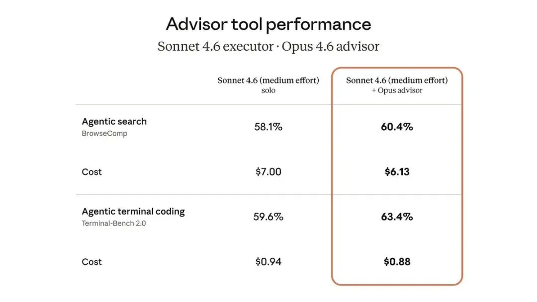 测试结果显示,Sonnet配Opus顾问在SWE-bench多语言测试上的表现比单独使用Sonnet提高了2.7个百分点,同时每个任务的成本降低了11.9%。此外,Haiku在搭配Opus顾问后,其在BrowseComp测试中的得分从19.7%提升至41.2%,尽管分数仍低于Sonnet单干的结果,但成本仅为Sonnet的15%,适合处理大量但对智能要求不高的任务。