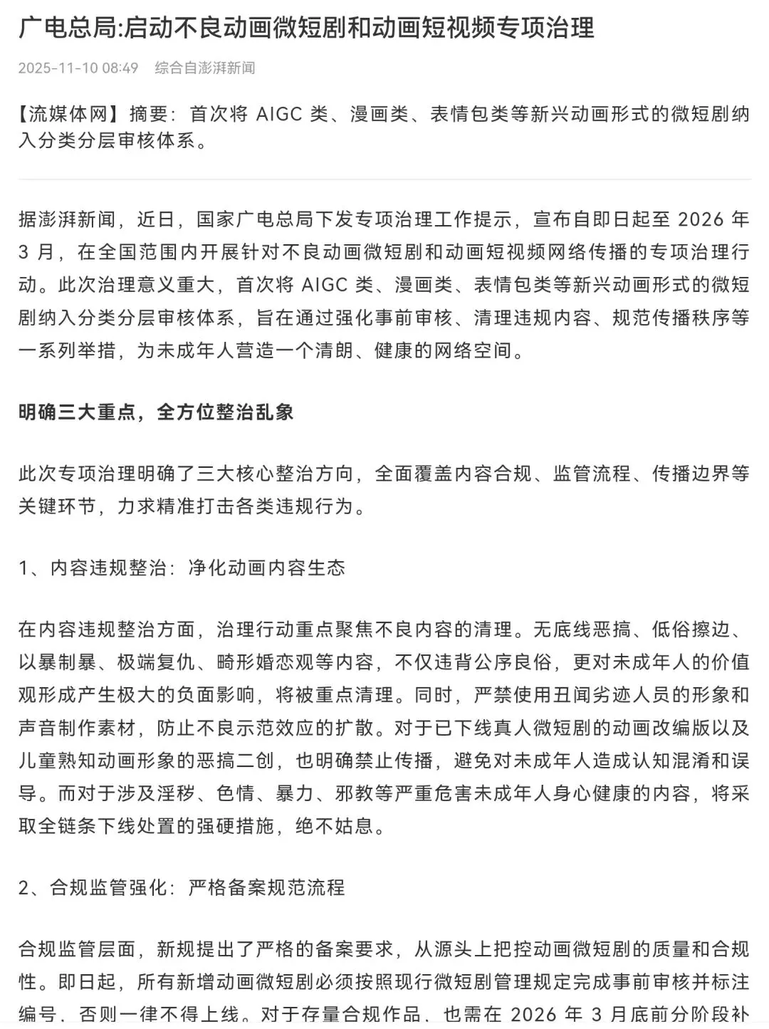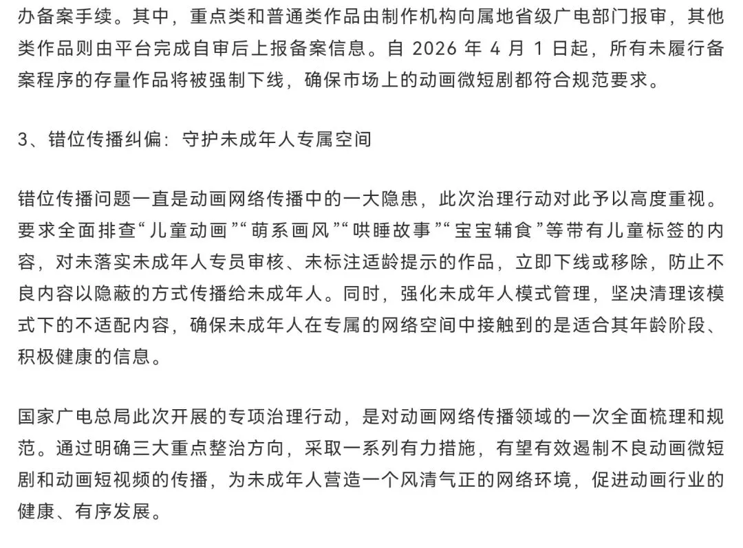 解读一下广电总局发布的内容:1、自2026年4月1日起,国家广电总局明确要求:ai漫剧 须先备案后上线,未备案内容将全网下架。新规将漫剧正式纳入网络微短剧分类分层审核体系,实行“投资额+题材”三级审核机制。