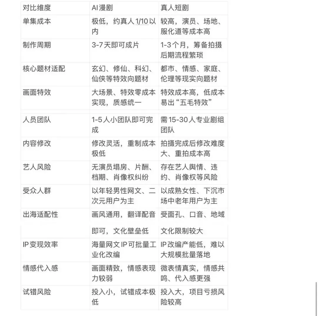 在看ai漫剧制作相比真人短剧制作(如下图)