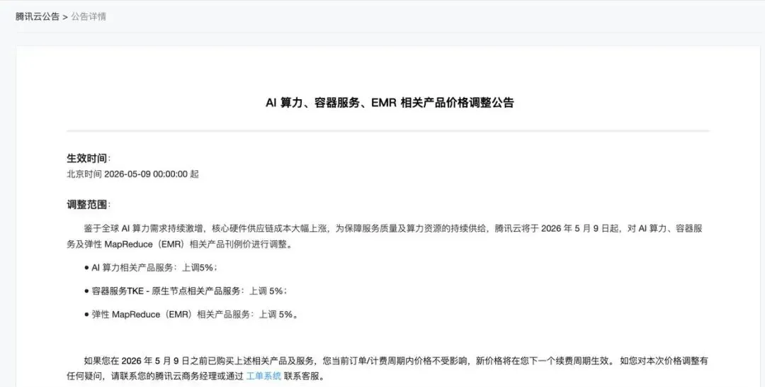 4月9日,腾讯云发布公告,自2026年5月9日起,对AI算力、容器服务TKE-原生节点、弹性MapReduce(EMR,一种大数据分析工具)三类产品价格统一上调5%。已购买服务的用户,在当前计费周期内不受影响。