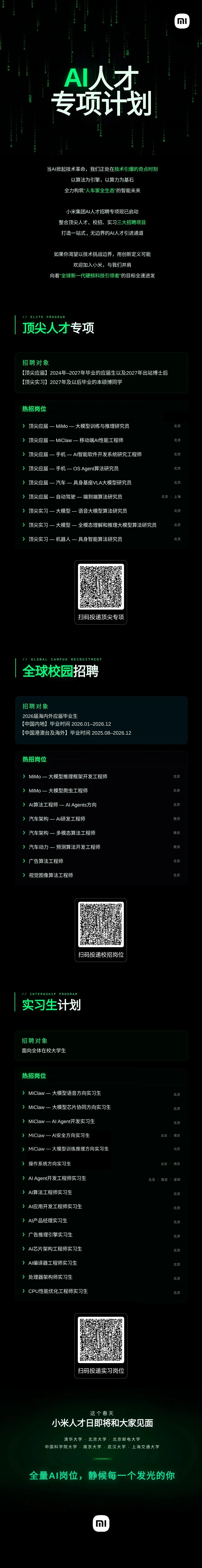 小米集团AI人才专项计划小米集团成立于2010年4月,2018年7月9日在香港交易所主板挂牌上市,是一家以智能手机、智能硬件和IoT平台为核心的消费电子及智能制造公司。声明:公众号 @光谷人才 定位光谷地区招聘信息公益分享,光谷企业均可免费发布真实可靠的招聘信息。来源:中国光谷 若有侵权请联系删除提醒:请不要向招聘方转任何费用!