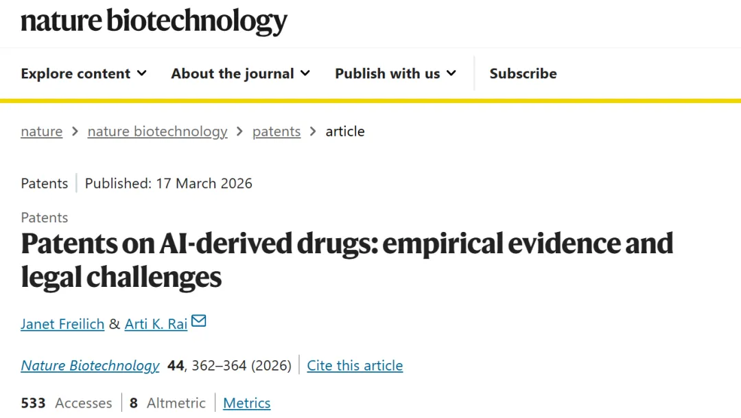 2026年3月17日,杜克大学法学院的Arti K. Rai与波士顿大学法学院的Janet Freilich在《Nature Biotechnology》上发表文章,题为“Patents on AI-derived drugs: empirical evidence and legal challenges”。