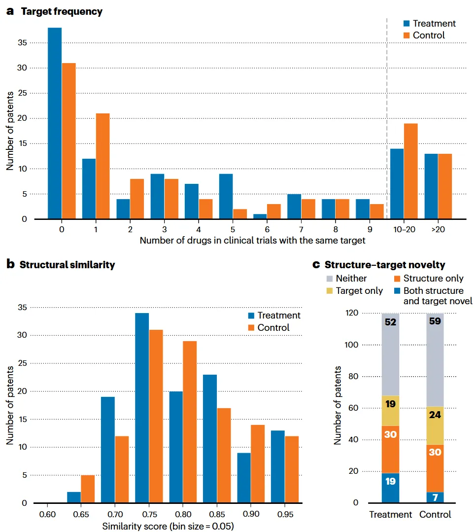图1 对AI原生公司提交的专利(处理组)与匹配的非AI生成专利(对照组)从三个维度进行科学独特性分析:靶点独特性、结构独特性以及靶点-结构组合独特性。