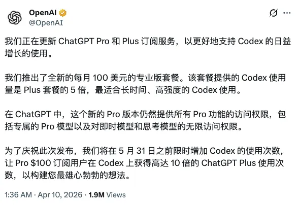 4月9号,OpenAI推出了一个新的ChatGPT Pro订阅层级,每月100刀。5倍于Plus的Codex使用量,5月31号之前限时10倍。