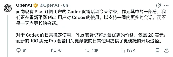那些被卡在20和200之间的重度用户,要么忍着等额度重置,要么咬咬牙花10倍的价钱升级Pro。Sam Altman自己都承认,200的Pro套餐在亏钱,因为用户用得太狠了。