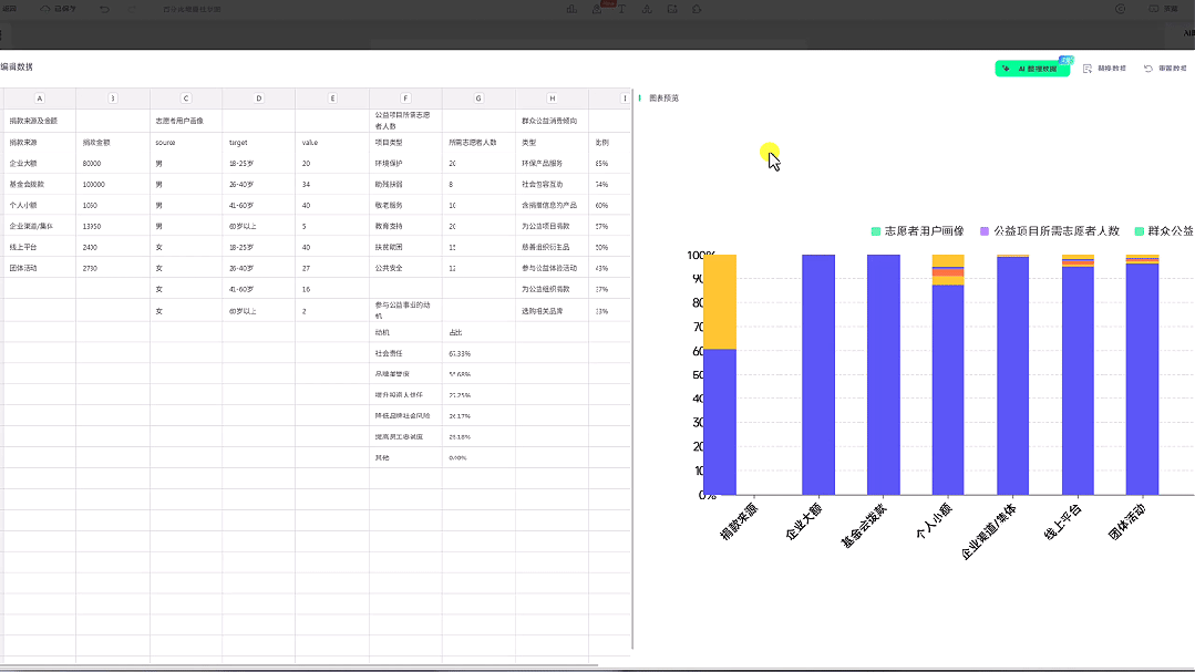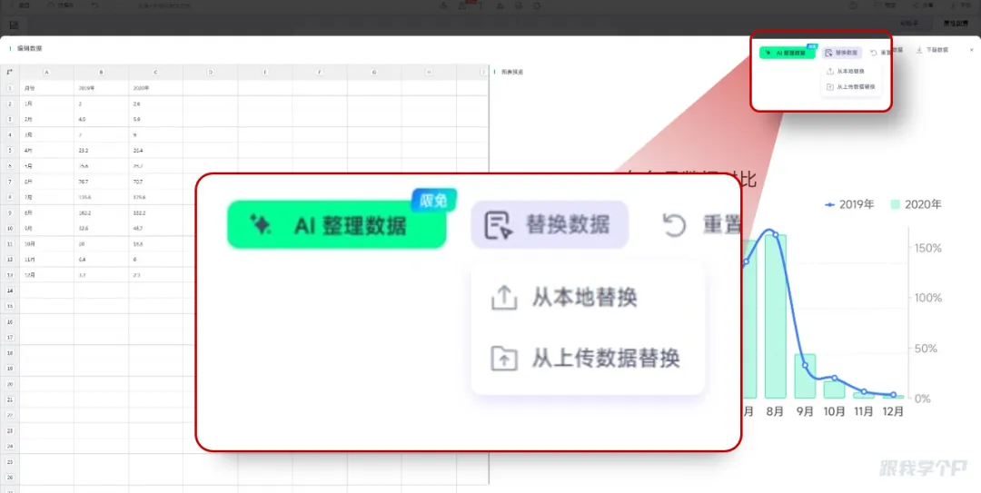 在这里,除了可以修改表格数据或者替换表格数据,它还支持AI整理数据: