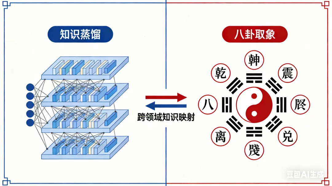 当我们将AI的知识蒸馏与传统的取象思维并置观察,会发现更为深刻的认知共振。知识蒸馏与八卦取象都是一种“认知压缩”过程。大模型的万亿参数被压缩到百万级别,正如万千自然现象被概括为八种卦象。两者都试图在信息过载的世界中,寻找那些“最小必要知识单元”,用最经济的认知成本掌握最多样的现象。两者都实现了“知识迁移”的智慧。蒸馏后的小模型能够处理训练中未见的新任务,正如八卦能够推演未发生的未来事件。这种泛化能力的获得,不依赖于对表面特征的死记硬背,而是把握了那些可迁移的深层模式与关系。两者都建立了“层次化理解”的架构。知识蒸馏中,教师模型传递的是从低级特征到高级概念的多层次表征。同样,八卦取象也形成了从具体物象到抽象属性,再到系统关系的多层次映射网络。理解一个卦象,需要同时把握其自然对应、社会对应、人事对应和时序对应等多个层次。这种跨越千年的思维相似性或许揭示了一个深刻的认知原理:人类在面对复杂系统时,无论是古代智者观察自然,还是现代科学家构建AI,都倾向于寻找那些能够“以简驭繁”的认知范式。这不仅是技术需求,更是认知的生物学限制所驱动的必然选择。05 思维方式的启示:从AI看传统,从传统看AI
