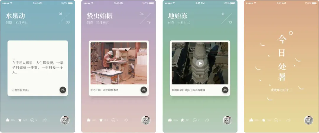 它的节气板块提供了二十四节气和七十二候的详细介绍,提供了丰富的手绘插画,每张插画都是精致美观,不仅有精美画面,还配有反映其物候特征的音乐,让你可以通过画面和声音对当前物候有直观的感受。