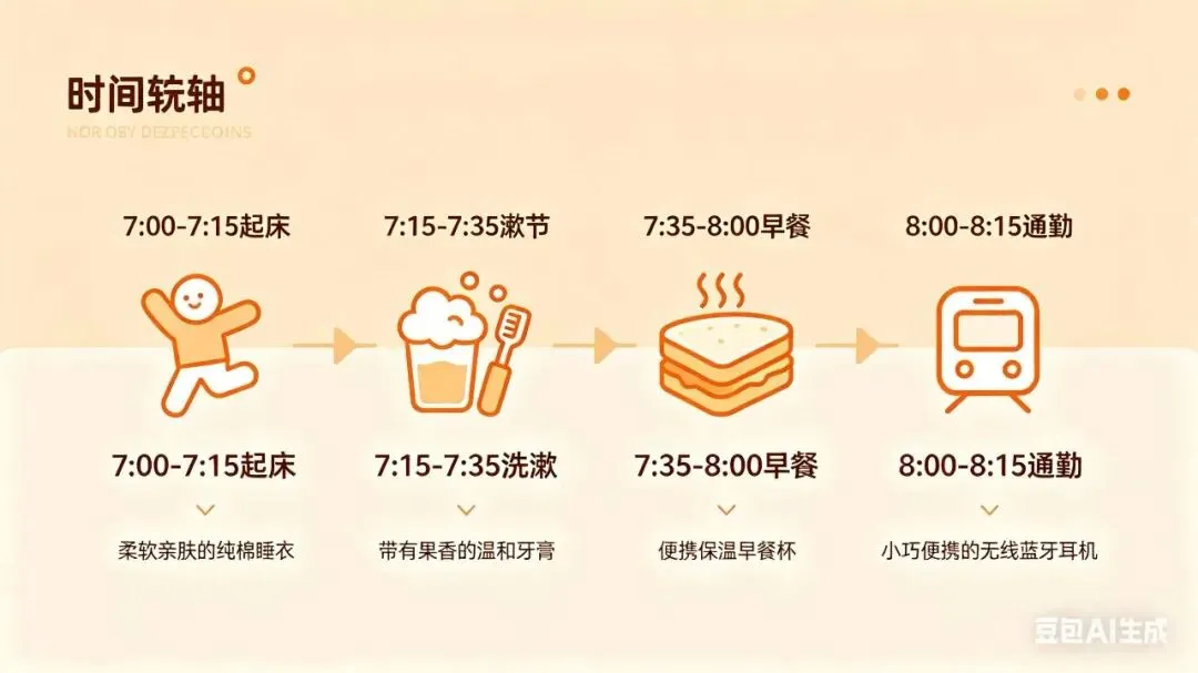 根据你的作息和工作时间,建议:- 起床时间:7:00(保证 7.5 小时睡眠)- 晨间流程:洗漱 15min + 早餐 20min + 通勤 40min- 今日天气:晴,温度 18-25°C,建议穿薄外套- 今日待办:3 个重要任务,建议上午完成最难的那个AI 推荐的晨间好物: