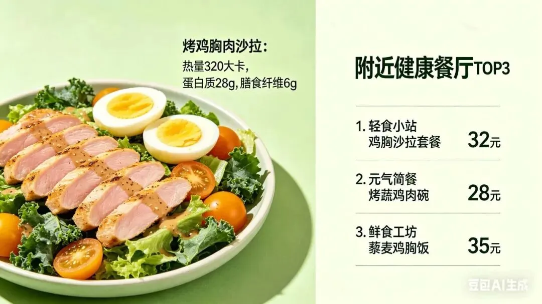 实际体验:⭐⭐⭐⭐听了 AI 的建议点了清蒸鱼,比平时吃的红烧肉清爽多了,下午不犯困!