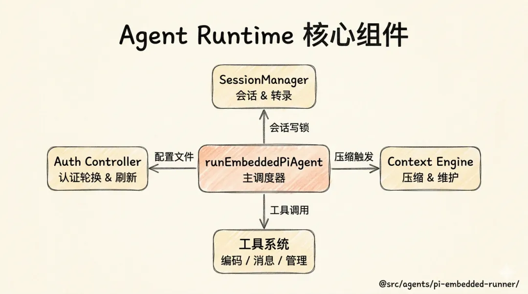 src/agents/├── pi-embedded-runner/│ ├── run.ts # 主入口(runEmbeddedPiAgent)│ ├── run/│ │ ├── attempt.ts # 单次运行尝试(runEmbeddedAttempt)│ │ ├── payloads.ts # 响应载荷构建│ │ └── params.ts # 参数类型定义(RunEmbeddedPiAgentParams)│ ├── runs.ts # 运行状态管理(队列、中止)│ ├── auth/│ │ └── controller.ts # Auth Controller(createEmbeddedRunAuthController)│ ├── context-engine/ # 上下文引擎(替代直接压缩)│ │ ├── index.ts│ │ └── lifecycle.ts│ ├── compact.ts # 传统会话压缩│ ├── session-lock.ts # 会话写锁(acquireSessionWriteLock)│ ├── types.ts # 核心类型定义│ ├── session-manager-cache.ts # SessionManager 缓存│ └── ...(其他辅助模块)├── pi-embedded-subscribe.ts # 流式事件订阅├── pi-tools.ts # 工具创建(createOpenClawCodingTools)├── pi-embedded-helpers.ts # 辅助函数(错误分类等)└── bundle-mcp/ # Bundle MCP 工具运行时 └── runtime.ts2. 核心组件