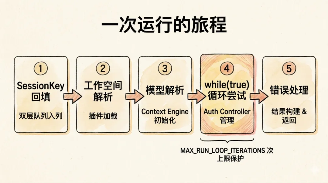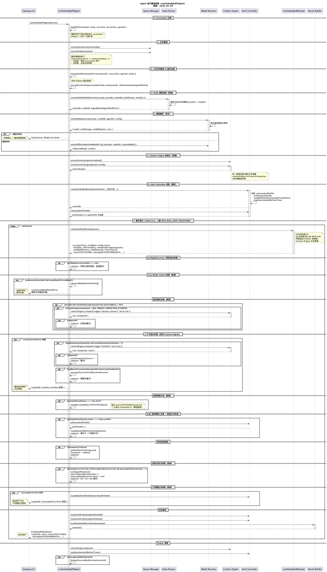 0. SessionKey 回填(早期规范化) backfillSessionKey({ config, sessionId, sessionKey, agentId }) → 确保所有下游(Hook、LCM、压缩等)都接收到非空 sessionKey1. 队列管理 enqueueSession() → enqueueGlobal() → 会话级队列:防止同一会话并发运行 → 全局级队列:控制全局并发2. 工作空间解析 & 插件加载 resolveRunWorkspaceDir({ workspaceDir, sessionKey, agentId, config }) → 支持 fallback 路径(workspaceResolution.usedFallback) ensureRuntimePluginsLoaded({ config, workspaceDir, allowGatewaySubagentBinding }) → 延迟绑定运行时插件3. Hook 模型选择(新增) resolveHookModelSelection({ prompt, provider, modelId, hookRunner, hookContext }) → 允许插件 hook 在运行前替换 provider/modelId → 结果: { provider, modelId, legacyBeforeAgentStartResult }4. 模型解析(异步) resolveModelAsync(provider, modelId, agentDir, config) → 从模型注册表查找模型定义 resolveEffectiveRuntimeModel({ cfg, provider, modelId, runtimeModel }) → 处理运行时模型覆盖(如动态切换)5. Context Engine 初始化(新增) ensureContextEnginesInitialized() contextEngine = await resolveContextEngine(params.config) → 新增的上下文引擎抽象层,替代直接调用 compactEmbeddedPiSessionDirect → contextEngine.compact() / contextEngine.dispose() → contextEngine.info.ownsCompaction 决定谁负责触发压缩6. Auth Controller(重构) createEmbeddedRunAuthController({ ...状态引用... }) → 封装所有认证配置文件管理逻辑 → 提供: advanceAuthProfile / initializeAuthProfile / maybeRefreshRuntimeAuthForAuthError / stopRuntimeAuthRefreshTimer7. 循环尝试(while(true),上限 MAX_RUN_LOOP_ITERATIONS) runEmbeddedAttempt(...) ── 成功路径 ── → buildEmbeddedRunPayloads() → markAuthProfileGood / markAuthProfileUsed → 返回 EmbeddedPiRunResult ── 新增错误路径 ── a) 超时触发压缩(timeout + 高 token 占用率 > 65%) contextEngine.compact({ trigger: "timeout_recovery", force: true }) → 压缩成功 → continue(重试) → 失败 → 转普通超时错误处理 b) 上下文溢出(改用 contextEngine) contextEngine.compact({ trigger: "overflow", force: true }) → 支持 MAX_OVERFLOW_COMPACTION_ATTEMPTS=3 次尝试 → 工具结果截断: truncateOversizedToolResultsInSession() → 完全失败 → 返回 context_overflow 错误 c) 速率限制 → 配置文件轮换限制升级 maybeEscalateRateLimitProfileFallback() → 超过 rateLimitProfileRotationLimit → 升级为 FailoverError(模型降级) d) 规划仅执行(Planning-Only)检测(新增) resolvePlanningOnlyRetryInstruction() → 检测到 Agent 只规划但未执行 → 注入 "act-now" 指令重试(最多 1 次) → emitAgentPlanEvent() 通知上层 e) 不完整轮次(Incomplete Turn)检测(新增) resolveIncompleteTurnPayloadText() → prompt() 提前解析但无 payload → 返回用户可见错误提示 f) 实时模型切换(Live Model Switch)(新增) shouldSwitchToLiveModel() → 检测到待处理的模型切换请求 → 抛出 LiveSessionModelSwitchError 触发上层切换8. 结果构建 buildEmbeddedRunPayloads() → 整合 assistantTexts、toolMetas、lastAssistant → 返回 EmbeddedPiRunResult(含 successfulCronAdds、messagingToolSentMediaUrls)关键特性