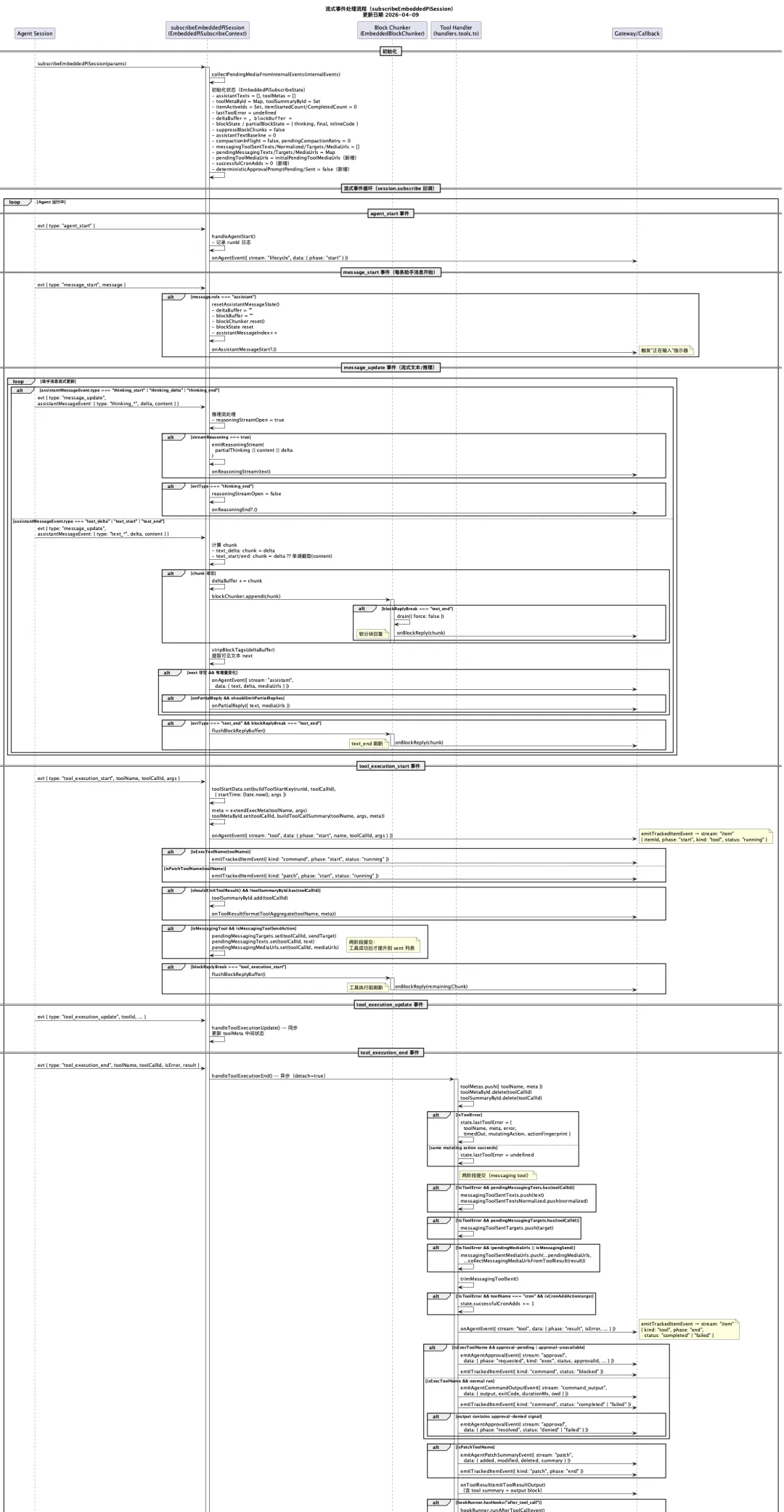 createAgentSession() ↓subscribeEmbeddedPiSession(params) ↓┌─────────────────────────────────────┐│ 事件监听器注册 ││ - text_delta ││ - message_start ││ - message_end ││ - tool_calls ││ - tool_result ││ - compaction_start/complete │└─────────────────────────────────────┘ ↓Agent 开始流式输出 ↓┌─────────────────────────────────────┐│ text_delta 事件 ││ deltaBuffer += delta ││ ↓ ││ 检测 <think>/<final> 标签 ││ ↓ ││ 更新 blockState ││ ↓ ││ 推送到 blockChunker ││ ↓ ││ 触发 onBlockReply(chunk) │└─────────────────────────────────────┘ ↓┌─────────────────────────────────────┐│ tool_calls 事件 ││ 存储 toolMetas ││ ↓ ││ 执行工具(如 exec、read_file) ││ ↓ ││ 返回工具结果 │└─────────────────────────────────────┘ ↓┌─────────────────────────────────────┐│ tool_result 事件 ││ 更新 toolMetas ││ ↓ ││ 检测消息工具 ││ (telegram_send, whatsapp_send) ││ ↓ ││ 去重已发送文本 │└─────────────────────────────────────┘ ↓┌─────────────────────────────────────┐│ message_end 事件 ││ finalizeAssistantTexts() ││ ↓ ││ 合并最终文本 ││ ↓ ││ 推送到 assistantTexts │└─────────────────────────────────────┘ ↓返回完整结果