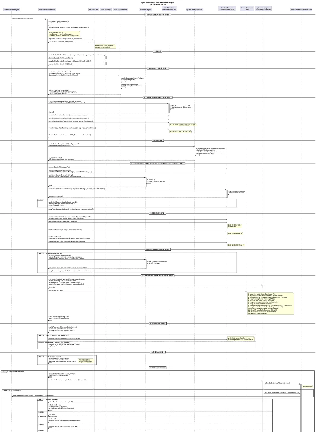 1. 工作空间初始化 fs.mkdir(resolvedWorkspace) → 支持沙盒隔离(sandbox.enabled) → effectiveWorkspace 根据沙盒访问级别选择路径 acquireSessionWriteLock({ sessionFile, maxHoldMs }) ← 新增会话写锁2. 技能加载 resolveEmbeddedRunSkillEntries(workspaceDir, config, agentId, skillsSnapshot) applySkillEnvOverridesFromSnapshot() | applySkillEnvOverrides() → 从 skillsSnapshot 或 .skills/ 目录加载 → 应用环境变量覆盖3. Bootstrap 文件处理 resolveAttemptBootstrapContext({ contextInjectionMode, bootstrapContextMode, ... }) → 加载工作空间引导文件(如 AGENTS.md/CLAUDE.md) → analyzeBootstrapBudget() 分析 token 预算 → 支持 lightweight/full 模式(bootstrapContextMode) → buildBootstrapPromptWarning() 生成截断警告4. 工具创建(含 Bundle MCP/LSP) createOpenClawCodingTools() ← 内置编码工具 normalizeProviderToolSchemas() ← provider 规范化 getOrCreateSessionMcpRuntime() + materializeBundleMcpToolsForRun() ← Bundle MCP(新增) createBundleLspToolRuntime() ← Bundle LSP(新增) effectiveTools = [ ...tools, ...bundleMcpTools, ...bundleLspTools ] → toolsAllow 过滤(最小化模式)5. 系统提示构建 buildEmbeddedSystemPrompt() ← 主体系统提示 resolveSystemPromptOverride() ← 允许配置完全替换 resolveProviderSystemPromptContribution() ← provider 特有贡献(新增) → 含 heartbeatPrompt、ttsHint、memoryCitationsMode → effectivePromptMode: "full" | "minimal"(toolsAllow 时用 minimal)6. SessionManager 初始化 prewarmSessionFile(sessionFile) SessionManager.open(sessionFile) + guardSessionManager() runAttemptContextEngineBootstrap() ← Context Engine 引导(新增) buildEmbeddedExtensionFactories() ← 扩展工厂(新增) DefaultResourceLoader({ extensionFactories }) ← 资源加载器(新增) applyPiAutoCompactionGuard() ← auto-compaction 守卫7. 历史消息处理 sanitizeSessionHistory() → validateReplayTurns() ← 新增 validateReplayTurns filterHeartbeatPairs() ← 心跳消息过滤(新增) limitHistoryTurns() → sanitizeToolUseResultPairing() pruneProcessedHistoryImages() ← 历史图像裁剪(新增)8. Context Engine 消息组装(新增) assembleAttemptContextEngine({ contextEngine, messages, tokenBudget, ... }) → 可注入 systemPromptAddition → 替换 messages(memory、增强等)9. Stream 传输策略(重构) resolveEmbeddedAgentBaseStreamFn() ← 基础流函数 registerProviderStreamForModel() ← provider 特有流(新增) shouldUseOpenAIWebSocketTransport() ← WebSocket 传输(新增) → streamFn 链式包装: - dropThinkingBlocks / sanitizeToolCallIds(transcriptPolicy) - wrapStreamFnSanitizeMalformedToolCalls - wrapStreamFnTrimToolCallNames - wrapStreamFnRepairMalformedToolCallArguments(Anthropic) - wrapStreamFnDecodeXaiToolCallArguments(xAI) - wrapStreamFnHandleSensitiveStopReason - streamWithIdleTimeout(LLM 空闲超时,新增) - GooglePromptCacheStreamFn(Google 提示缓存,新增) - sessions_yield 中止检测10. 预检溢出检测(新增) shouldPreemptivelyCompactBeforePrompt() → route: "truncate_tool_results_only" → 提前截断工具结果 → route: "compact_only" / "compact_then_truncate" → 触发 preflightRecovery11. 图像注入(增强) detectAndLoadPromptImages({ sandbox, workspaceOnly, ... }) → 支持沙盒路径限制 → imageOrder 控制注入顺序12. Agent 运行 createAgentSession({ builtInTools, customTools: [...customTools, ...clientToolDefs], ... }) → Client Tools(OpenResponses 托管工具,新增) → sessions_yield 工具(新增) await activeSession.prompt(effectivePrompt, { images? }) → 超时管理:scheduleAbortTimer 含 compactionGrace 扩展13. 订阅流式事件 subscribeEmbeddedPiSession() → 详见序列图 0314. Context Engine 轮次收尾(新增) finalizeAttemptContextEngineTurn({ contextEngine, ... }) → 触发 after_compaction hooks15. 返回结果 { assistantTexts, toolMetas, lastAssistant, sessionIdUsed, aborted, timedOut, idleTimedOut, timedOutDuringCompaction, ← 新增 preflightRecovery, ← 新增 yieldDetected, ← 新增 clientToolCall, ← 新增 successfulCronAdds, ← 新增 messagingToolSentMediaUrls, ← 新增 compactionCount, attemptUsage, promptCache ← 新增 }关键特性