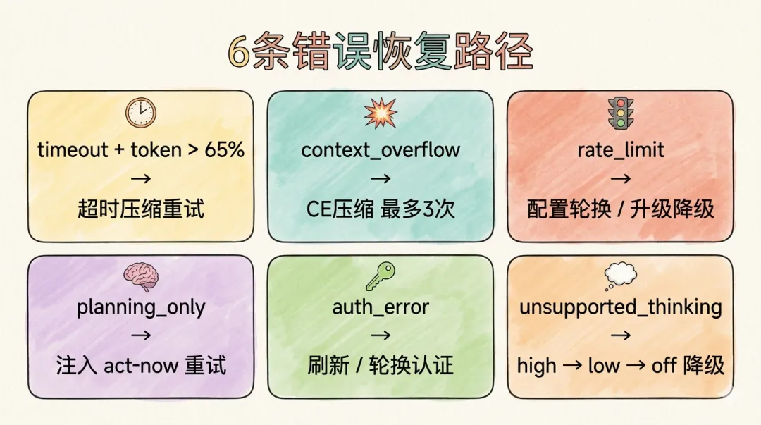 • 双层队列: 会话级 + 全局级,防止并发冲突 • Auth Controller: 封装认证管理,支持运行时刷新 • Context Engine: 新的上下文引擎抽象,统一管理压缩/维护 • 超时触发压缩: LLM 超时时若 prompt token 占用率 > 65% 自动压缩 • 规划重试: 检测 planning-only 轮次并注入执行指令 • 速率限制升级: N 次轮换后自动升级为模型降级 • 思考级别降级: 不支持时自动降级(high → low → off) • GitHub Copilot 特殊处理: 动态 token 交换
