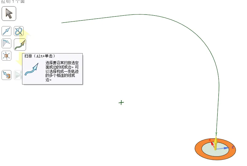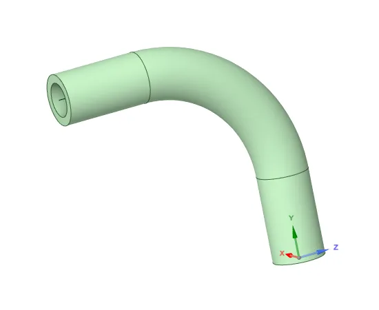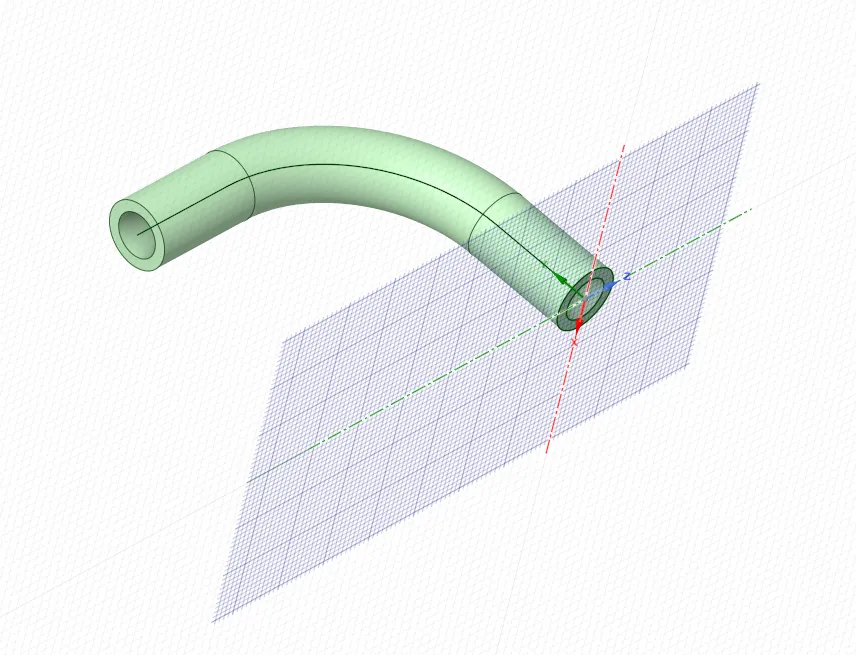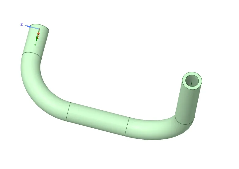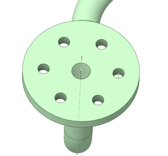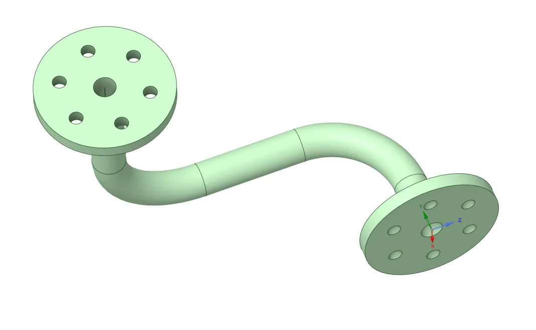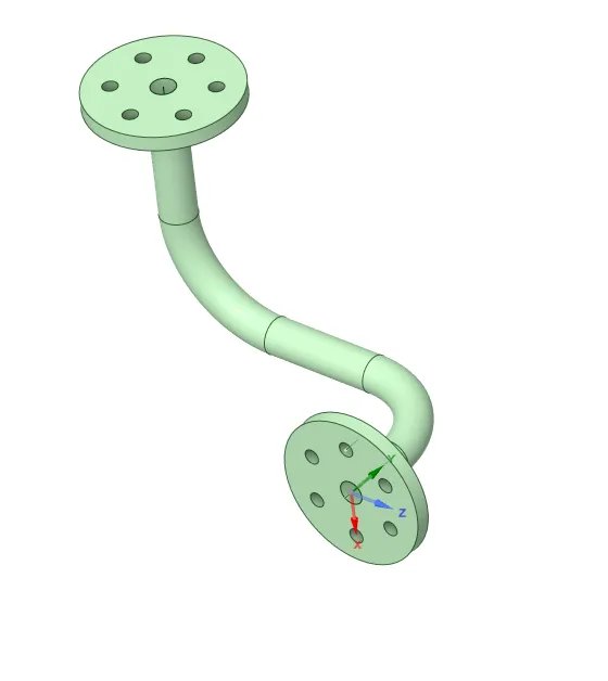 Ansys SC软件三维建模—空间三维水管法兰问题描述:绘制如下图水管,部分尺寸见操作步骤,水管内径8mm,外经12mm。(结束草图编辑——点击草图模式——点击X轴(新建绘图平面垂直于水管截面)——点击平面图,绘制轨迹曲线)3、扫略(点击水管截面——点击扫琼——点击轨迹曲线——点击完全拉动),用相同方式扫琼整个曲线。4、定义扫琼曲线平面(点击草图模式——点击移动——点击移动栅格——移动栅格50mm——点击平面图,绘制轨迹曲线)6、绘制法兰(点击草图模式——点击水管截面——点击平面图,绘制法兰)8、阵列安装孔(点击孔——点击圆型阵列——点击轴线)
