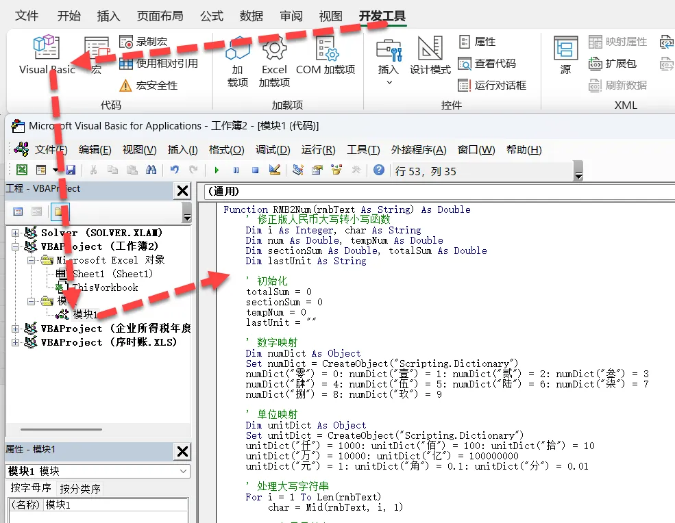 开发工具,VB,插入模块,粘贴代码。