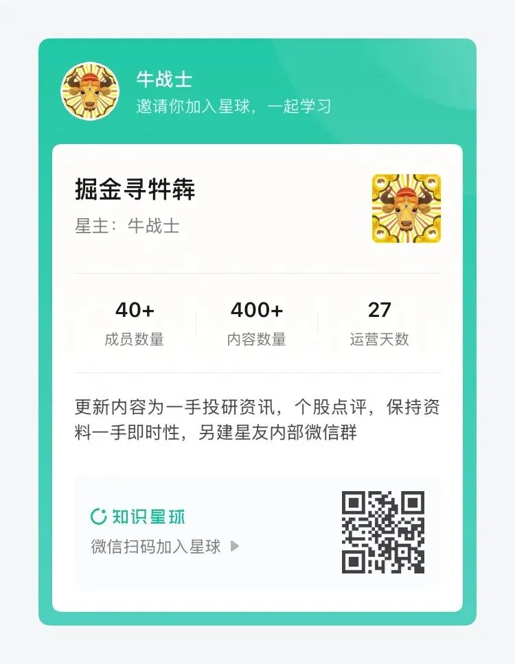 欢迎加入「掘金寻犇牪」用一线信息增强投资底气,以独家视角穿越市场迷雾。(风险提示:市场有风险,投资需谨慎。星球信息仅供参考,不构成投资建议。)