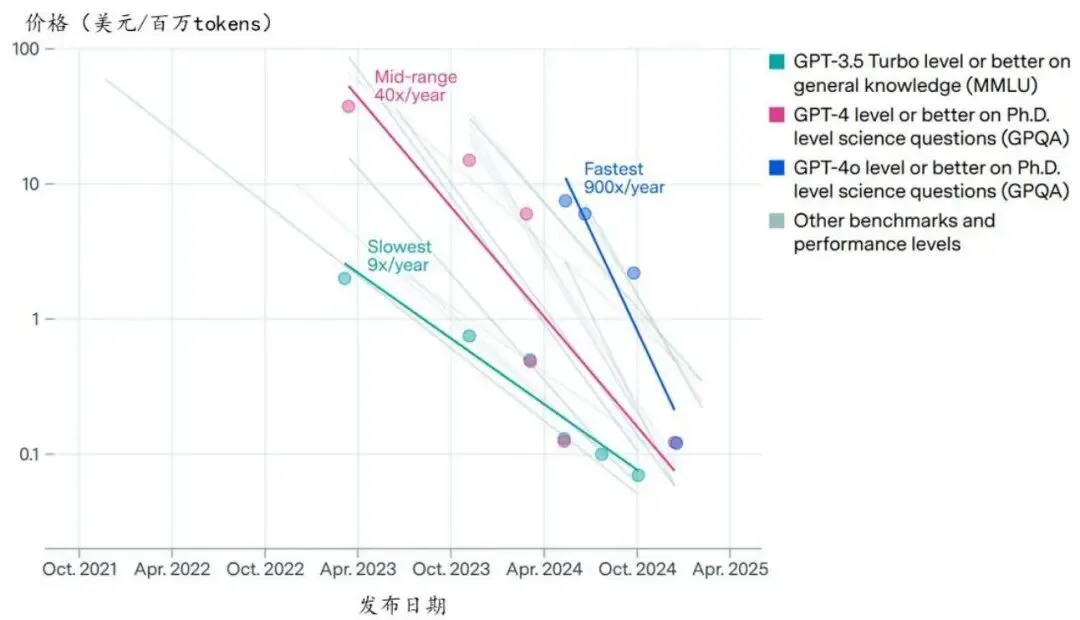 锚定特定模型能力,推理成本随时间呈现数量级下降(美元/百万 tokens)