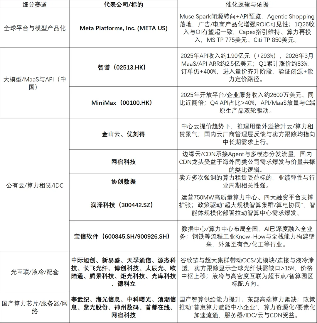 - 首选:META(Muse Spark移除发布悬顶、产品化可见性上行、广告与电商闭环强化ROIC预期);国内API/MaaS龙头(智谱、MiniMax)验证量价齐升与“能力定价”