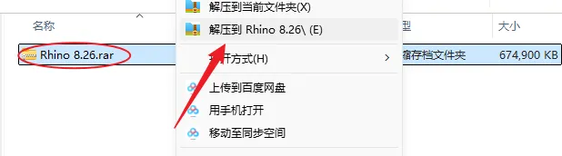 1.解压安装包:鼠标右击【Rhino 8.26】压缩包,选择电脑上安装的解压软件,点击解压到【Rhino 8.26】。