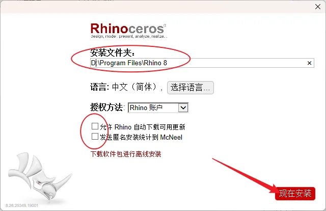 5.修改路径地址中的首字符C可更改安装位置,本例安装到D盘,取消图示勾选,点击现在安装。