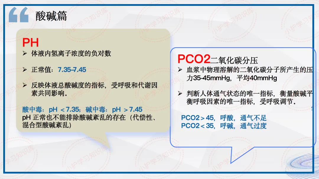 pH值:正常范围是7.35-7.45,它反映体液的总酸碱度,受呼吸和代谢因素共同影响。 pH < 7.35是酸中毒,> 7.45是碱中毒。但要注意,pH正常也不能排除酸碱紊乱的存在,比如代偿性或混合型酸碱紊乱。