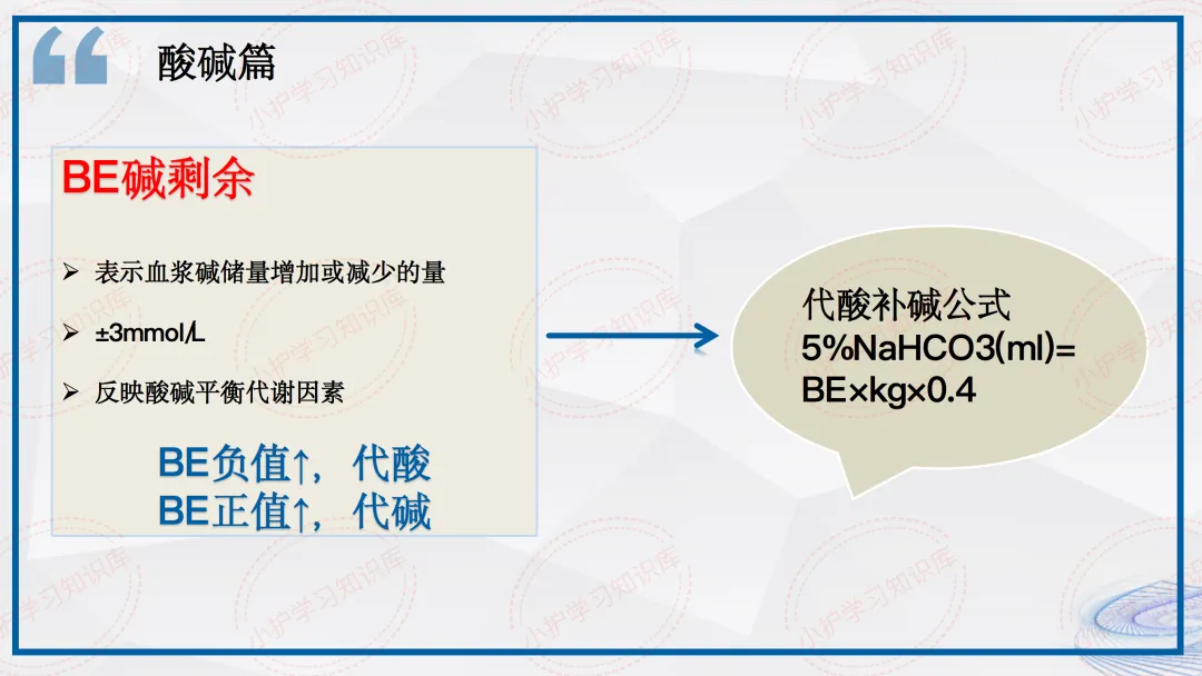 BE(碱剩余)和HCO₃⁻(碳酸氢根):它们反映酸碱平衡的代谢因素。BE正常值±3mmol/L,负值增大提示代谢性酸中毒(代酸),正值增大提示代谢性碱中毒(代碱)。 HCO₃⁻正常值22-27mmol/L,其变化也反映代谢状态。