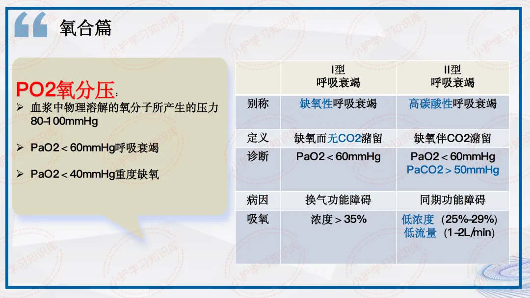 PO₂:正常值80-100mmHg。PaO₂ < 60mmHg即可诊断为呼吸衰竭,< 40mmHg为重度缺氧。