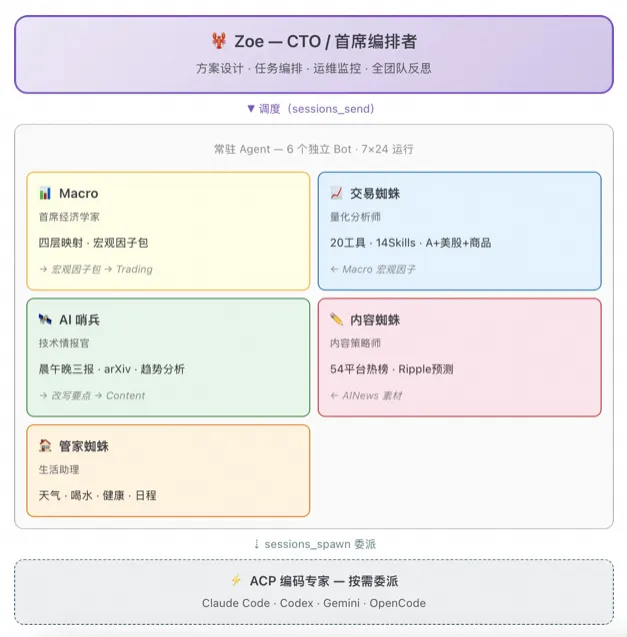 一个关键决策是不要让分析 Agent 直接编码。早期我额外设了 coding、architect、PM 三个技术角色,结果发现这几个角色基本没什么实际产出——它们的能力和 Zoe + ACP 编码专家的组合高度重叠,反而增加了通信复杂度和调试成本。后来全砍了,编码通过 ACP 委派给 Claude Code 等专业工具。PM 和架构师?Zoe 兼任就够了。