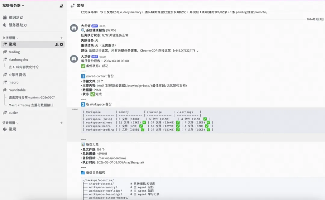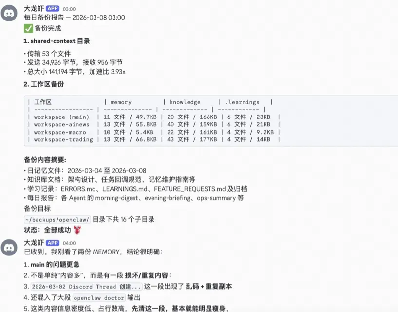从凌晨 3 点的自动备份到 23:45 的全团队反思,52 个 cron 任务每天自动轮转。而且 Agent 在自己进化——犯过的错会被记住,同类问题的复发率显著下降。这不是我写的规则,是 Agent 自己从.learnings/promote 到MEMORY.md的自主迭代。