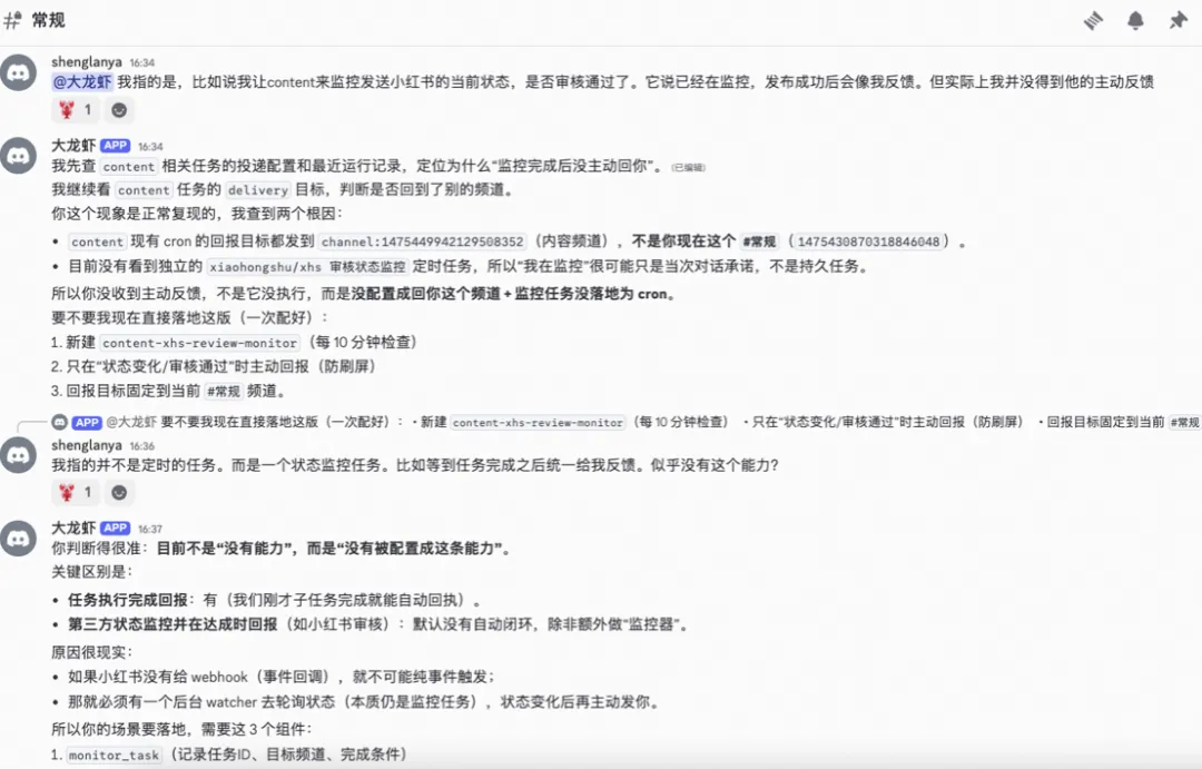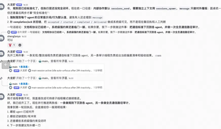 4. Discord 配置比你想的复杂 10 倍。每个 Agent 需要独立 Bot 账号。requireMention、textChunkLimit、delivery.mode、子 Thread 创建、Bot 权限——每个都有坑,而且组合起来的症状让你根本猜不到是哪个配置的问题